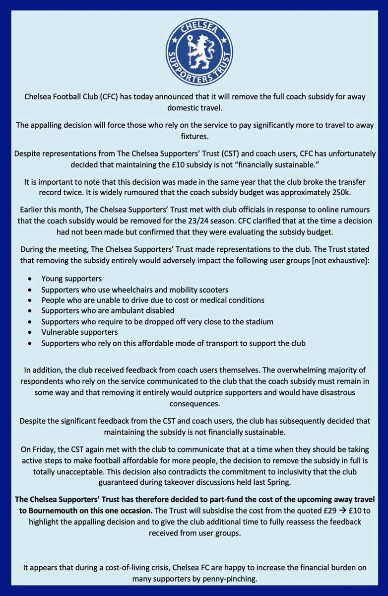 Они опубликовали следующее заявление, подтверждающее, что Фонд частично профинансирует расходы на поездки на следующую выездную игру «Челси» против «Борнмута».