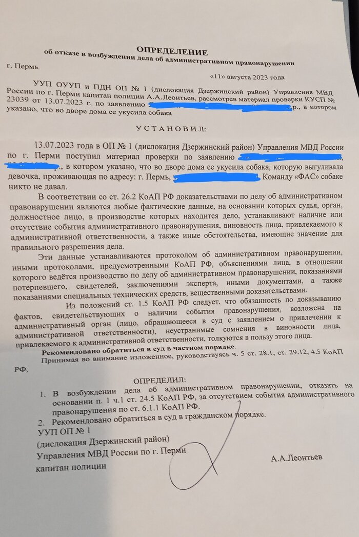 Предистория: у нас в доме держат немецкую овчарку, которую выгуливает мальчик, которому ещё нет 14 лет. Он её спускает с поводка около дома, пострадали уже несколько человек. С хозяевами уже беседовали, им просто пофиг. История: меня укусила эта собака, когда я выгуливала свою, сразу после этого я сняла на видео, как она бегает вокруг нас, не уходит и игнорирует подзыв мальчика. После этого я поехала в травмпункт, где зафиксировала укус, потом поехала в полицию и написала заявление. Нашла 4х соседей, кто сможет подтвердить, что собака опасна. Но ни со мной, ни с ними, ни с председателем дома никто не связывался, а вчера пришла эта отписка. В письме даже перепутали, написали, что была девочка, а не мальчик. Просто прекрасная фраза - раз никто не командовал "ФАС", значит всё ок (. Я не очень представляю, что сейчас делать юридически. Мне бы очень помогли грамотные советы. Пост автора Trhtlchk415. Читать комментарии на Пикабу.