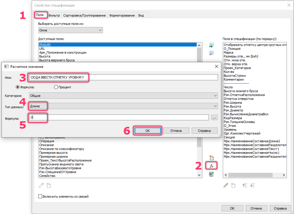 Здесь все максимально просто. Для начала давайте создадим расчетный параметр, в который будем задавать отметку уровня, назовем его “СЮДА ВВЕСТИ ОТМЕТКУ УРОВНЯ!!!”. Тип данных выберем “Длина”, а значение по умолчанию оставим 0. Советую оставлять данный столбец в спецификации по умолчанию открытым, чтобы исполнитель не забывал вводить корректную отметку уровня.