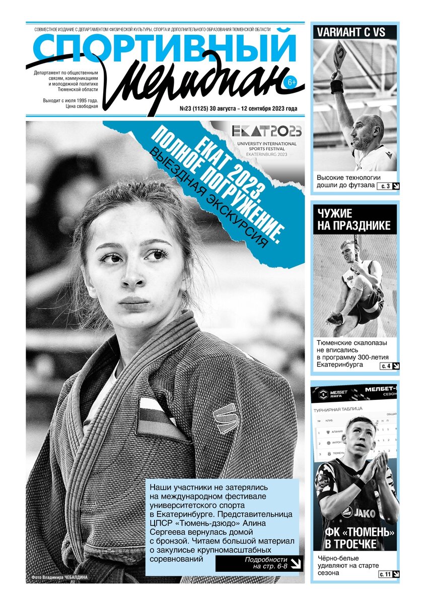 В среду вышел в свет очередной номер областного еженедельника «Спортивный меридиан». «Роль личностей в первой гостевой победе» — так называется публикация о делах на футбольном фронте. В ней «СМ» пишет о выездном матче «Тюмени» в Жигулёвске против «Акрона». Это была встреча чемпионата страны по футболу среди клубов 1-й лиги. «Стальная хватка» — под таким заголовком издание даёт фоторепортаж о чемпионате России по скалолазанию. Газета напечатала материалы о футзальном турнире на призы Тюменской области. Он состоялся в первом городе Сибири на площадке спорткомплекса «Прибой». Также газета поместила публикацию о предстоящем чемпионате Всероссийской хоккейной лиги, где сыграет тюменский «Рубин». Под рубрикой «Событие» газета пишет о международном фестивале университетского спорта, который проходил в Екатеринбурге. Ещё «СМ» сообщает о тренировках сборной России по биатлону в тюменской «Жемчужине Сибири». Также найдёте материалы под традиционными рубриками — «Исторический ракурс» и «Спортпан
