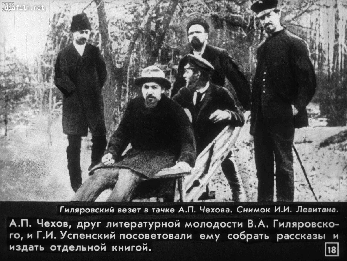Слово «дяде Гиляю» – Владимиру Гиляровскому: «…мы купили арбуз, завязанный в толстую серую бумагу, которая сейчас же стала промокать, как только Чехов взял арбуз в руки. Мы поползли по Страстной площади, визжа полозьями по рельсам конки и скрежеща по камням. Чехов ругался — мокрые руки замерзли. Я взял у него арбуз. Действительно, держать его в руках было невозможно, а положить некуда. Наконец, я не выдержал и сказал, что брошу арбуз. — Зачем бросать? Вот городовой стоит, отдай ему, он съест. — Пусть ест. Городовой! — поманил я его к себе. Он, увидав мою форменную фуражку, вытянулся во фронт. — На, держи, только остор... Я не успел договорить: “осторожнее, он течет”, как Чехов перебил меня на полуслове и трагически зашептал городовому, продолжая мою речь: — Осторожнее, это бомба... неси ее в участок... Я сообразил и приказываю: — Мы там тебя подождем. Да не урони, гляди. — Понимаю, вашевскродие. А у самого зубы стучат. Оставив на углу Тверской и площади городового с “бомбой”, мы поехал