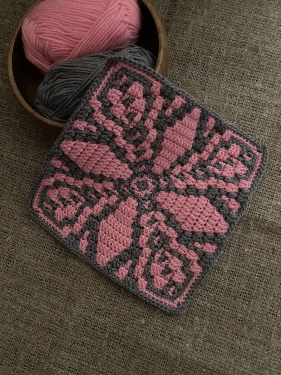 Для вязания использовала пряжу серого и розового цветов, мотив при этом получился таким "выразительным" и вдохновляющим.😉