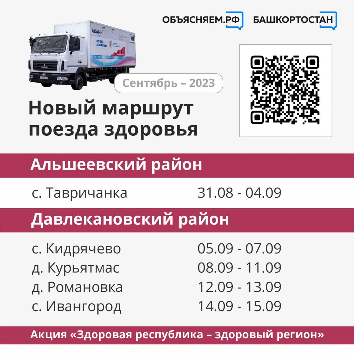 Записываться к специалистам не нужно — приём проводится в порядке живой очереди. Главное, взять с собой паспорт и полис ОМС. Коллеги из «Объясняем. Башкортостан» подготовили карточки с маршрутом поезда здоровья на сентябрь.