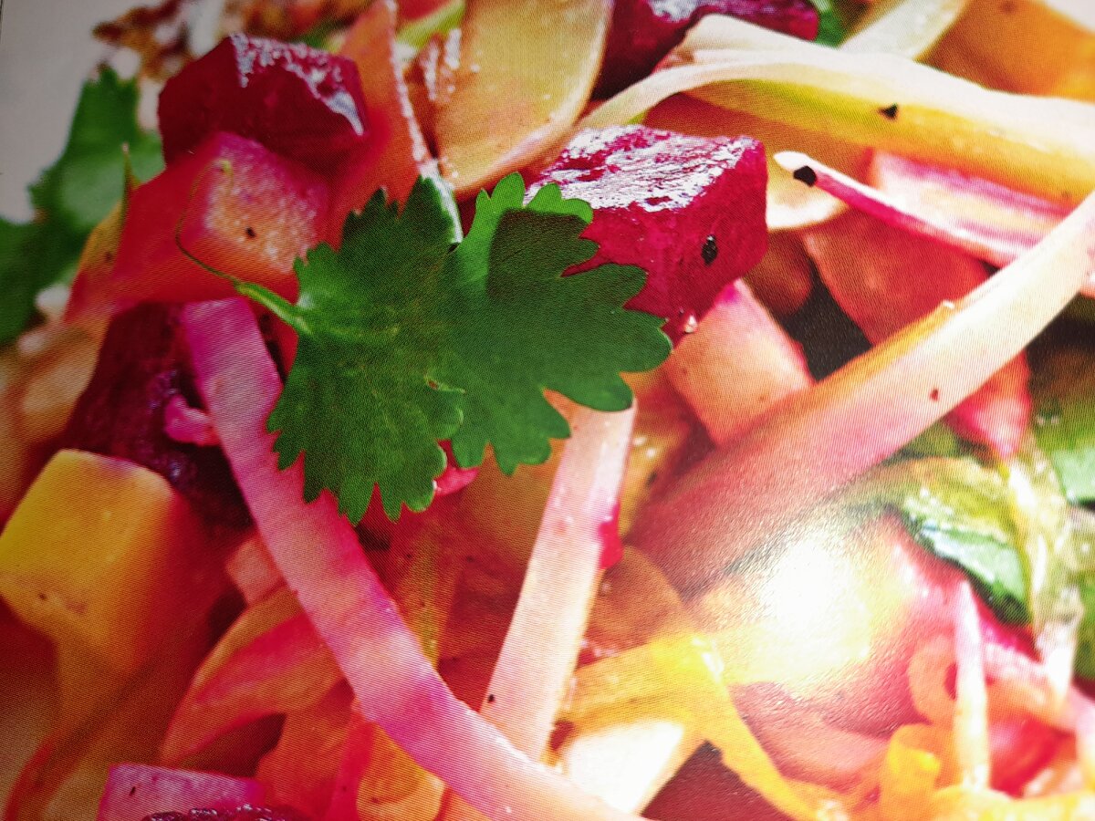 Состав 🌟 варёная свекла-1 шт 🌟 варёный картофель -2шт 🌟 корень сельдерея-1 шт небольшого размера 🌟 зелёное яблоко-1шт 🌟 шампиньоны -4шт Также по вкусу: 2 веточки петрушки, несколько листиков кинзы,оливковое масло,бальзамический уксус,соль,перец,горцица. Порезать,сложить в миску,заправить горчицей,маслом уксусом, солью и перцем. Все размешать и украсить листиками кинзы. Салат готов! Приятного аппетита. Спасибо, что Вы со мной.