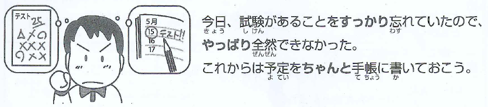 Я совсем забыл, что сегодня экзамен, поэтому, как и ожидалось, совсем не смог его сдать. Теперь я буду как следует записывать планы в записную книжку. おぼえましょう