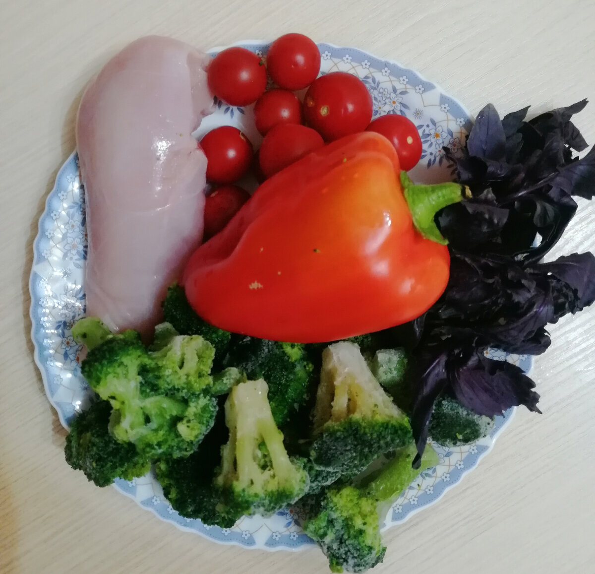 Приготовим ещё один вкусный салатик с любимой брокколи. Нам понадобится 400 гр. брокколи, 300 гр. куриного филе, помидоры черри 200 гр., один болгарский перец, веточка базилика, соль, перец, оливковое масло. Куриное филе нарезаем небольшими кусочками, обжариваем на растительном масле до готовности. Брокколи отвариваем в подсоленной воде 5 минут и промываем холодной водой. Когда курица и брокколи остынут собираем наш салатик. Черри режем пополам, перец нарезаем полосками, листья базилика режем очень мелко. Все ингредиенты выкладываем в салатник, солим, перчим и заправляем оливковым маслом, можно добавить немного лимонного сока. Приятного аппетита!