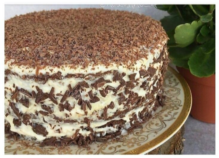 Для коржей: • 2 яйца 2 или 1,5 стакана сахара 2 стакана кефира 2 ст ложки какао @iskucctvo_kulinarii 2 стакана просеянной муки 2 ч ложки соды (без горки) Для крема: сливочное масло 200 гр сметана 20%-25% 250 гр сахар или сахарная пудра 0,5 стакана @kulinariya.mira шоколад для украшения Миксером или же венчиком взбить яйца с сахаром до пышности, влить кефир, всыпать какао. Размешать до однородной консистенции, всыпать муку и соду! Разделить тесто ровно на 2 части и выпекать в разъёмной форме диаметром 21 см, застелив дно пергаментной бумагой. Выпекаем при 180 гр, до готовности( в моём случае я выпекала 40 минут)! Готовым кордам даём немного остыть, и разрезаем каждый на 2 коржа! И оставляем до полного остывания! Тем временем готовим крем: миксером хорошо размягченное сливочное масло взбиваем с сахаром или сахарной пудрой до пышности, добавляем сметану и еще раз хорошенько взбиваем! Далее собираем тортик, и украшаем шоколадной крошкой. НV или по желанию !