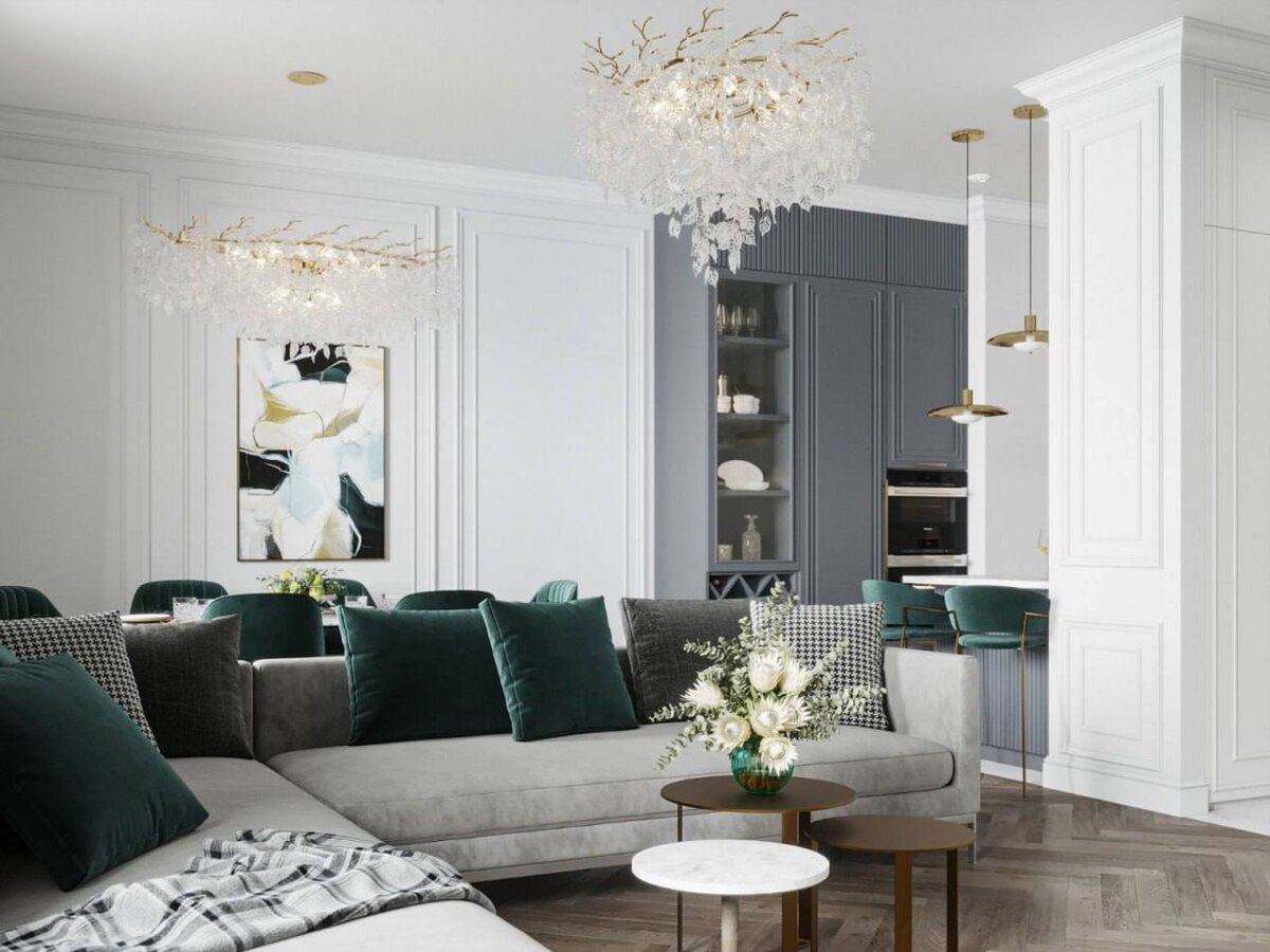 Изумрудный цвет отлично смотрится в неоклассике, ар-деко, современном стиле и минимализме. Даже в азиатском стиле он может красиво подчеркнуть лаконичность общего образа интерьера.