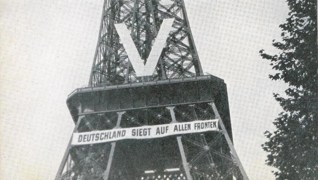 «Германия побеждает на всех фронтах» — гласит надпись на Эйфелевой башне.