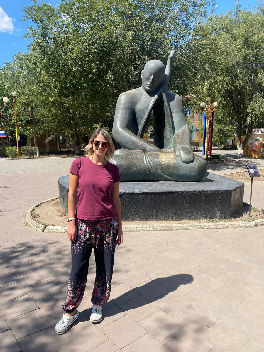 Скульптурная композиция «Эхо» Монументальная однофигурная композиция изображает мужчину с монгольским типом лица. Композиция представляет собой сидящего мужчину в позе «лотоса» - «падмасана», прижимающего к сердцу домбру. В центре фигуры - корпус домбры в виде пронизывающего человека проема. Это своеобразный символ открытости души калмыков. Сквозь проем звуками домбры доносится эхо прошлых и будущих поколений как олицетворение пространственной бесконечности. Аллегорическое отождествление человека со струной инструмента – эхо от звука домбры свидетельствует: культура не исчезнет, пока жива душа народа, которая всегда выражается в мелодии и песне. Несмотря на кажущуюся статику, при отсутствии детальной проработки элементов, скульптура полна внутреннего движения, мысли. Композиционный прием – «проем», как образное средство, в дальнейшем стал использоваться и другими скульпторами. Важная особенность общей планировки - скульптура и масштабно, и пространственно вплетена в окружающую среду,