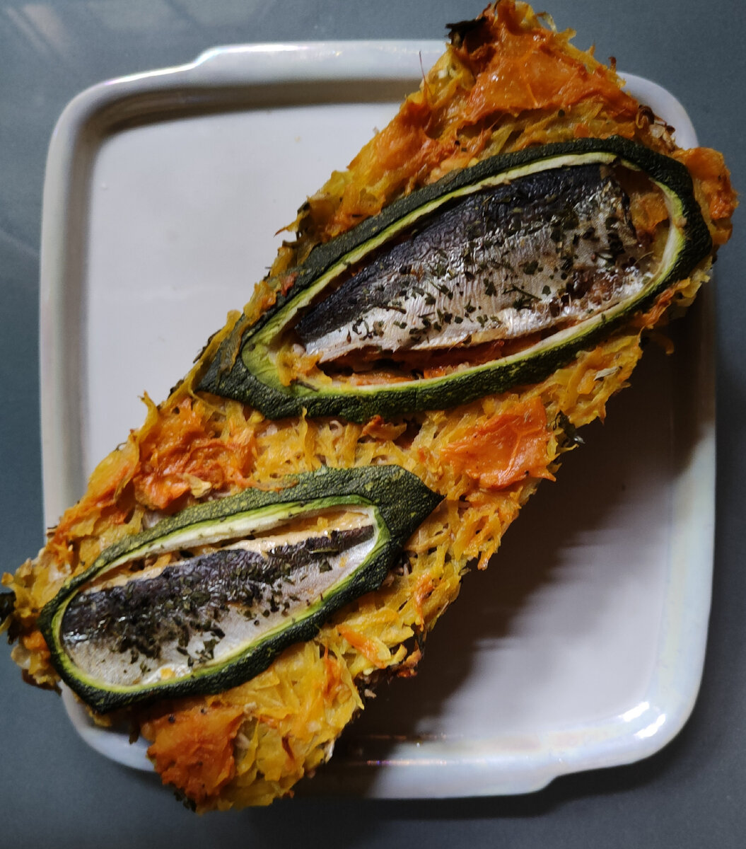 А затем опять слои овощей и овсяных хлопьев. Предпоследний слой - филе салаки, сверху тёртая тыква и декор из срезов цукини и салаки.