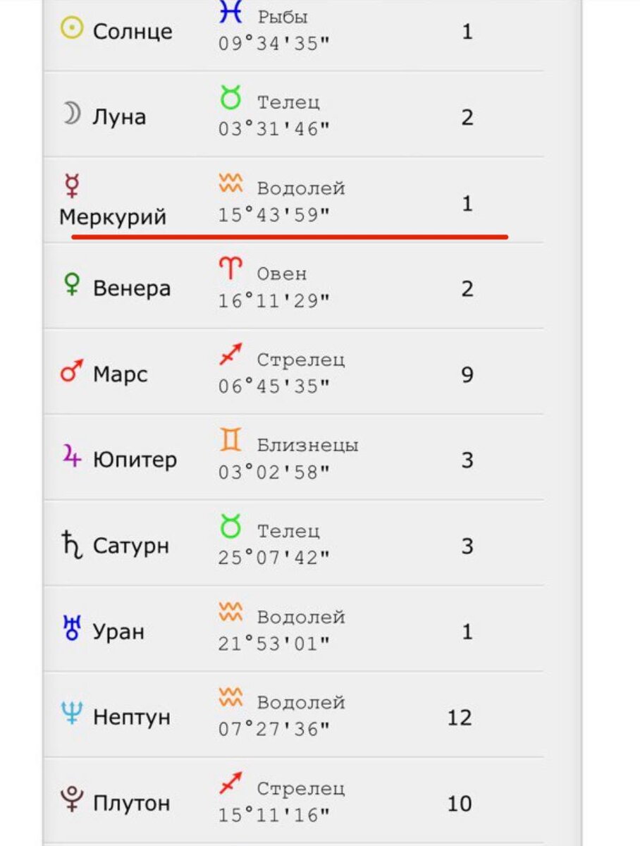 Смотрим в табличку под НК, ищем знак зодиака, в котором расположен наш Меркурий. На примере всё отметила для наглядности. У меня в Водолее!