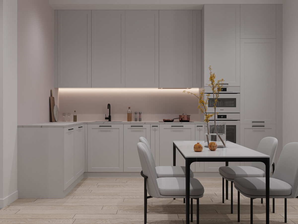 Дизайн интерьера квартиры в современном стиле площадью 45 кв.м. разработан для молодой девушки. Согласно пожеланиям клиента, в основе интерьера должен быть белый цвет и в отделке, и в мебели. При этом интерьер не должен выглядеть холодным и бездушным. Стены и потолки решено было покрасить краской с антивандальным эффектом, удобной в уходе. Чтобы интерьер не выглядел дешево, была выбрана инженерная доска в качестве напольного покрытия в комнатах. Кухонный гарнитур также выполнен в белом цвете и дополнен черной фурнитурой . Кухня оснащена самой современной бытовой техникой . Фартук у варочной панели и раковины выполнен из прозрачного стекла, а сама стена акцентно выкрашена в нежно-розовый оттенок. Удалось также выделить возле кухни место для маленькой гостиной с уютным диваном и ТВ. Спальня наполнена женской энергетикой. Она светлая, нежная и уютная. В нем располагается просторный шкаф в зеркалом во весь рост, прикроватная тумба и туалетный столик. Портьеры, подобранные в цвет стен,