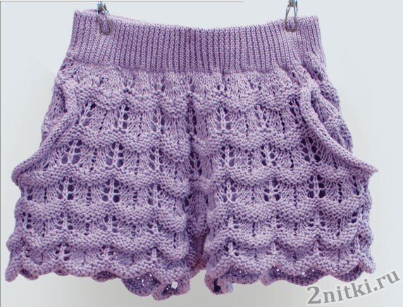 Пояс.Теперь можно одеть петли на круговые спицы, распустив вспомогательную нить. Начинаем вязать пояс. Тут тоже есть нюансы. Если ваши шортики неглубокие или у вас небольшая разница между талией и бедрами, то просто начинаем вязать резинку. Провязав до желаемой высоты резинки, провяжите один ряд лицевыми, так чтобы изнаночные протяжки были с лицевой стороны пояса и свяжите еще столько же. Этот лицевой ряд сломает рисунок и сформирует край. Не стягивая, максимально свободно закройте петли и пришейте к изнанке. Если у вас высокие шортики или большая разница между талией и бедрами то, надо сделать немного припосадку – равномерно убавьте петли в первом ряду и продолжайте вязать, как описано выше.