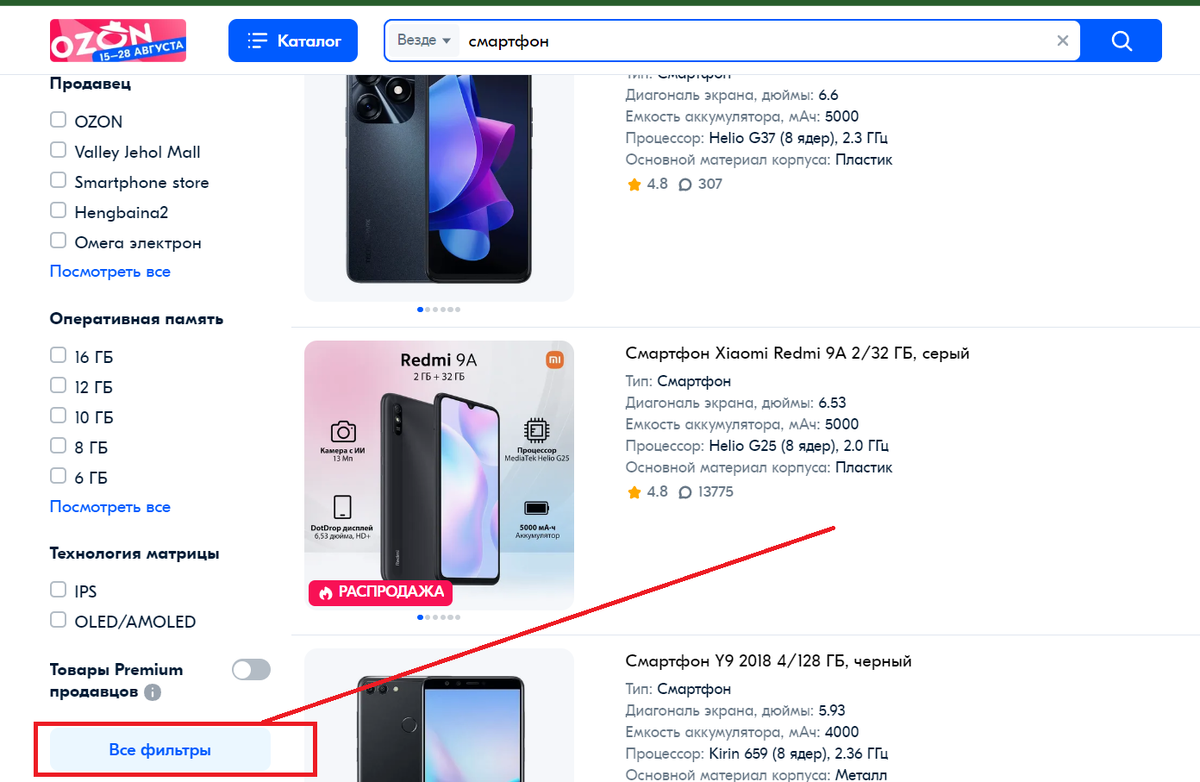 Точно также открываем новое окно по кнопке "Все фильтры". Хотя бы просто пробежаться глазами, а по каким критериям Озон предлагает выбрать телефон.