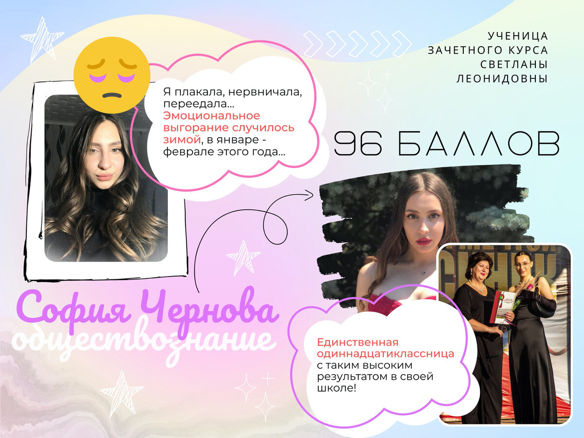 Ещё летом 2022 года я даже не подозревала, что буду готовиться к ЕГЭ дистанционно🙈 Раздумывая над тем, как будет проходить моя подготовка к экзаменам, я представляла лишь сборники и обучение в школе. Всё изменилось, когда я случайно увидела рекламу Зачётного курса! До этого дня я и не думала, что можно обучаться дистанционно (наверное, это странно, но я действительно не подозревала о существовании онлайн-школ😅🤦🏼♀️) Этот курс стал для меня неким открытием! Мне было немного страшно начинать дистанционное обучение… Я боялась, что будет сложно воспринимать теорию дистанционно, что у меня не получится наладить контакт с ребятами с курса. Но как же я ошибалась! Зачётный курс помог мне понять, что готовиться к ЕГЭ – совсем несложно и нестрашно!💞Безумно удобная платформа, прекрасное расписание вебов, достаточное количество времени для выполнения домашних заданий!⏳ Комфорт и уют - вот так двумя словами можно описать онлайн-подготовку на курсе у Светланы Леонидовны💜