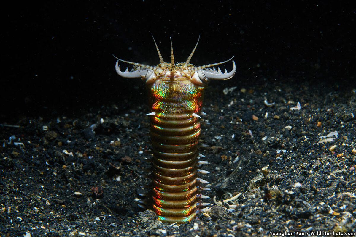 Червь Боббита или Eunice aphroditois – трехметровая полихета обитающая на небольших (но не менее 10 метров) глубинах тропических морей. И это действительно грозный хищник, – вооружённый ядом, челюстями, распахивающимися на 6 сантиметров, – очень быстрый. Тонкий, – тело не шире 2.5 сантиметров, – червь скрывается в донных отложениях и способен, почуяв движение добычи антеннами, совершать молниеносные броски на расстояние в седьмую часть собственной длины. Удар, как правило, точен и настолько внезапен, что мелкая рыба не успевает уклониться. Челюсти же червя нередко рассекают жертв пополам.