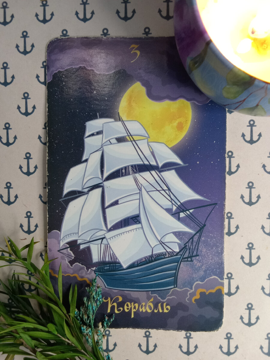 "Корабль" - это движение, путешествие и расстояние. Он предполагает отъезд, изменения, трансформацию, а так же отпуск и круиз. Карта "Корабль" в первую очередь обозначает действия, приближения или начало событий. Любые действия, начиная от переезда и заканчивая весомыми изменениями в вашей жизни. Наши мысли окрылились и с этого момента начинаются улучшения. "Корабль" может указывать и на транспортное средство. Ну и получение наследства тоже идет по этому Аркану, в особенности если рядом находится "Усыпальница". Безбрежная даль океана, изображенная на карте иногда символизирует об опасности. Но мы не забываем, что всегда нужно учитывать контекст вопроса, а так же близлежащие карты. Так же карта указывает на благосостояние, процветание и богатство. Поскольку напрямую связана с торговлей. И профессии по ней идут соответствующие. "Корабль" показывает нам вечернее время суток, начало пути, долгий период времени (больше одного года). "Корабль" представляет желание убежать и скрыться. Для
