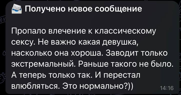 Я продолжаю отвечать на вопросы подписчиков в своем Телеграм-канале. Вам заходит такой формат, поэтому буду стараться выкладывать их здесь чаще :) Кстати, если у вас тоже есть вопросы, то вы можете задать их абсолютно анонимно. Для этого нажмите здесь. Ну а я перехожу к новому вопросу: Существует ли норма сексуальности? «Все относительно» — сказал Эйнштейн, и я вынуждена с ним согласиться. В мире сексологии в целом понятие нормы такой же относительный вопрос. Главное здесь вычленить, что нормально конкретно для вас и готовы ли вы с этим жить. Почему начинает нравиться экстремальный секс? Объяснение тому, что происходит, есть. Я говорю про это периодически и скажу снова: часто эта проблема связана с потребляемым графическим контентом. И да, я сейчас о 🔞фильмах. Как это работает? Мозг привыкает к интенсивным стимулам и тут все также как с наркотическими средствами. Возникает толерантность из-за того, что дофаминовые рецепторы теряют чувствительность и требуется уже бóльшая дозировка. Эт