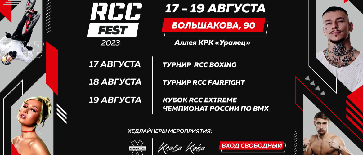 19 августа 2023 года в День города у КРК «Уралец» пройдет заключительный день большого спортивного праздника «RCC FEST». Здесь пройдет на площадке скейт-парка Кубок RCC Extreme – международный баттл между сильнейшими райдерами, а также Чемпионат России по BMX. Также вас ждут фотозоны, специальный фуд-корт, активности для детей и взрослых. Музыкальными хедлайнерами станут НИЛЕТО и КЛАВА КОКА. Вечером гостей ждёт шоу-программа с участием лучших битбоксеров, рэперов, джамперов, паркурщиков и танцоров. В финале праздника выступят хедлайнеры – NILETTO и Клава Кока.