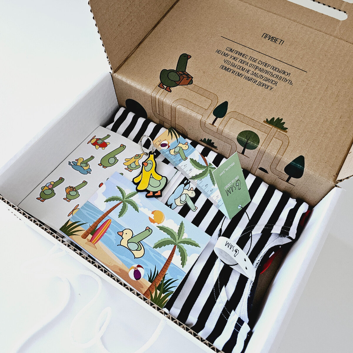 1. Мы решили сделать коробку в формате почтовой, наш гусь выступает почтальоном. Сама коробка из твердого картона, чтобы при пересылке ничего не помялось. И в дальнейшем, чтобы ребенок мог использовать коробку, как сундук. Когда мы открываем, нас встречает лабиринт. Нужно помочь Сэму добраться к домику. Зачем это сделано? Задача Бренда одежды не просто создавать качественную одежду, а дарить эмоции. В данном случаи мы порадуем малыша и дадим маме пару заветных минут тишины. Вы можете сколько угодно работать над качеством товара, но если это единственное ваше преимущество, то вы ничем не будете отличаться от конкурентов. Важной деталью в
