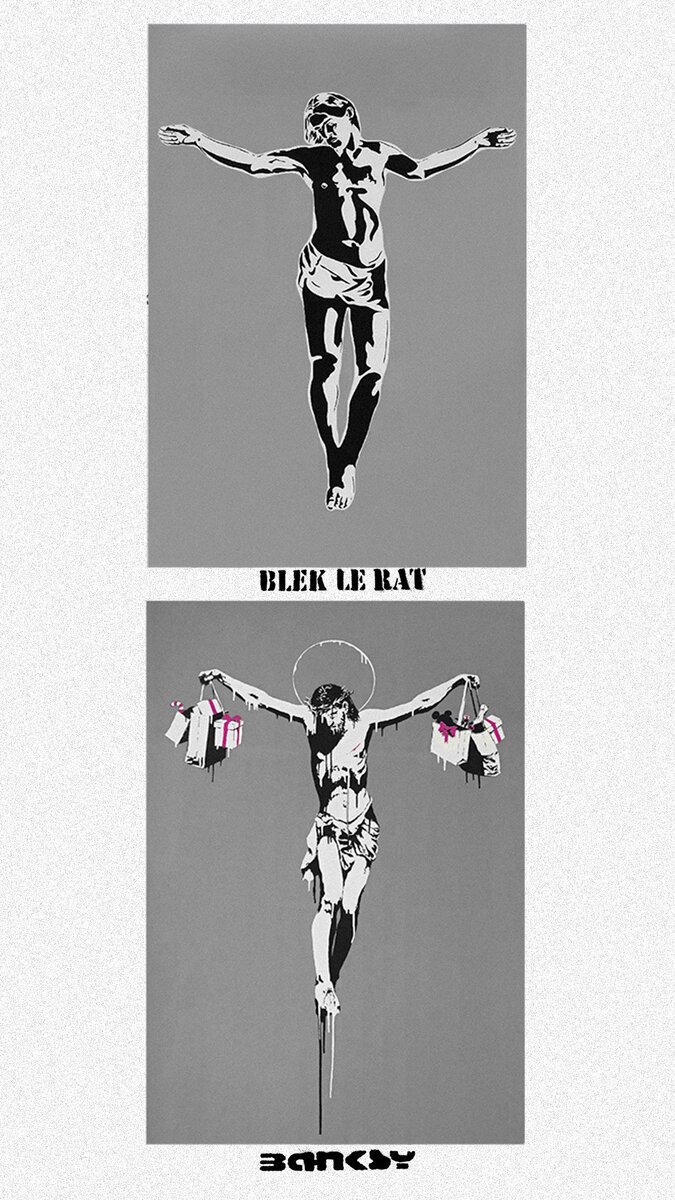 Это работы французского художника Блека лё Ра и Бэнкси. Первый бомбил в Париже, когда второй ещё учился держать в руках карандаши. Найдите 10 отличий. Забавно, что раньше Блек Лё Ра негативно отзывался о Бэнкси, а потом перестал (возможно, потому что тот подарил ему свою работу). И ещё Блек говорит, что видел Бэнкси вживую, но когда видел, не знал, что это он. По-моему, он просто в банде тех, кто знает и не говорит. Больше подробностей — в видео по ссылке https://www.youtube.com/watch?v=hNA6gsrENQw&t=84s