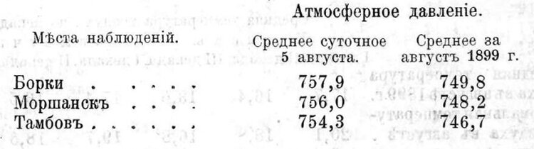 В августе 1899 года в Тамбовской губернии преобладало низкое атмосферное давление и Тамбовская губерния часто попадала в область, лежащую на границе антициклонов и циклонов, которые проходили главным образом по северной половине России. Барометрическое давление первой декады августа 1899 года обуславливается прохождением через Тамбовскую губернию одного антициклона и одного циклона. Антициклон распространяется на Тамбовскую губернию 3 августа, надвигаясь со Скандинавского полуострова на место циклона, господствовавшего до 3 августа в северной России, задевшего Тамбовскую губернию изобарой в 755 мм., и ушедшего на Белое море. Антициклон 3 августа пересекает Тамбовскую губернию по пути с северо-запада на юго-восток. Наибольшей величины атмосферное давление достигает 5 августа, что видно из следующей таблицы, в которой приведены средние суточные атмосферные давления в сравнении со средним давлением за август 1899 года.