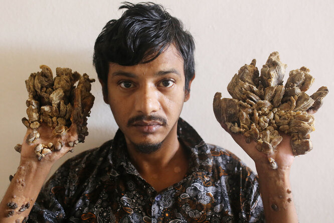 Житель Бангладеш Абул Бажандар (Abul Bajandar) страдает редким заболеванием, из-за которого ладони и ступни покрылись ужасными наростами. Проблема Абула не только эстетическая – наросты мешают ходить, есть, работать, выполнять ежедневные дела. Врачи помочь мужчине пока не смогли.