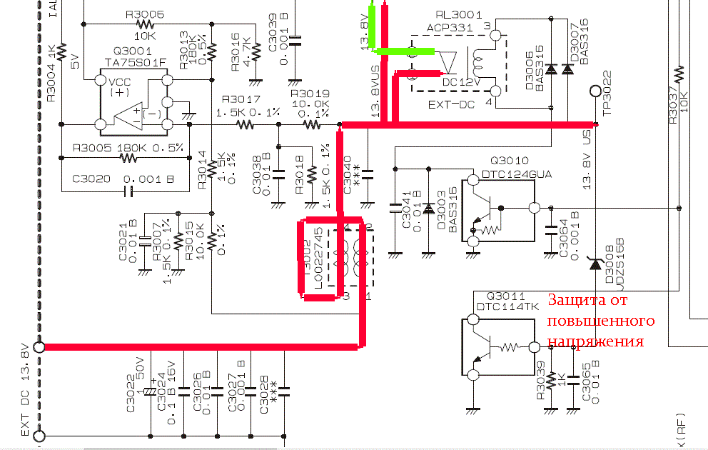 В ремонте чистокровный японский КВ/УКВ трансивер (рация) Данный трансивер эксплуатировался на таком дальнем Севере нашей страны, где кроме радио никакой другой связи нет. Так что в данном случае это не радиолюбительское хобби, а жизненная необходимость. Но вновь прибывшие на объект сотрудники, по чему то решили запитать его не от 12 Вольт, а от 24. После этого он перестал подавать признаки жизни. Хотя, что интересно, аппарат крайне защищенный от таких происшествий. Короче, получилось как в том анекдоте про японскую пилу. Открываем верхнюю крышку, а там... Настоящая красота радиоэлектроники - мощные ВЧ транзисторы с позолоченными крылышками-выводами, ровные ряды аккуратных катушек и релюшек различных размеров. Тут находится силовая часть радиостанции. После безликих плат от современных ноунейм телевизоров, тут просто произведение искусства. Внешний осмотр ничего не дает, приступаем к анализу схемы благо она есть в свободном доступе. Начинаем от входа питания. Красным на схеме выделе