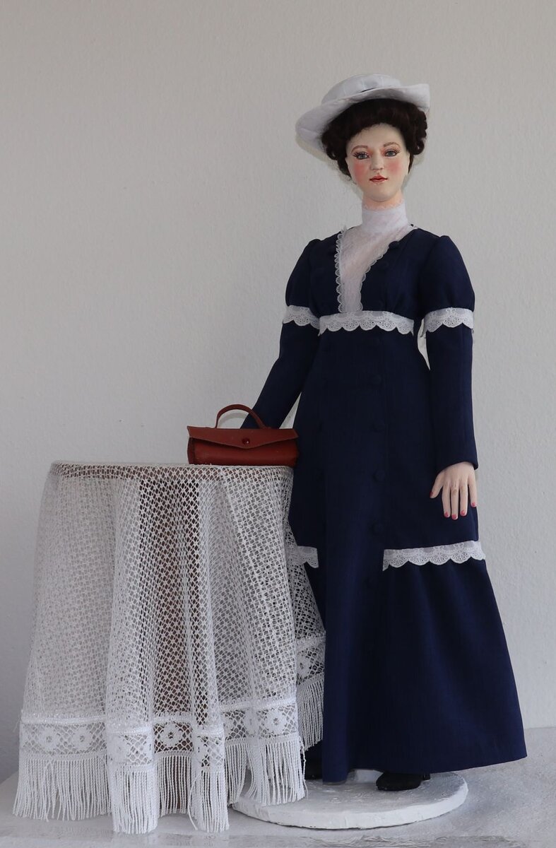 Однажды я получила письмо с просьбой переслать его мне. Женщина увидела в журнале моих кукол и у нее созрела мысль одеть куклу в платье своей родственницы. В письмо было вложено это фото. Это сестра ее бабушки 1885г.р. Семья их была большая, 8 девочек, жили на Волыни. Все девочки были рукодельницами, портнихами и это «очаровательное платье», как пишет женщина, она сшила сама. Фото снято 1908\10. вот фото покрупнее. Дама не высшего света, но городская. Полагаю, платье сшито из тонкой шерсти. Приталенный силуэт с расширенным низом, по моде того времени. Перед и спинка с рельефом от плеча, бочок с подрезом и сборкой, сверху отделка кружевом. Под грудью тоже отрезная кокетка украшенная кружевом и белая кружевная вставка, по краю пришито узкое кружево. По рельефу спереди 22 обтяжные, декоративные пуговицы. Воротник – высокая стойка, очень модный в то время. Рукав обычный, разрезной по горизонтали, нижняя часть со швом спереди, так тогда кроили, головка рукава чуть собрана и вставка кру