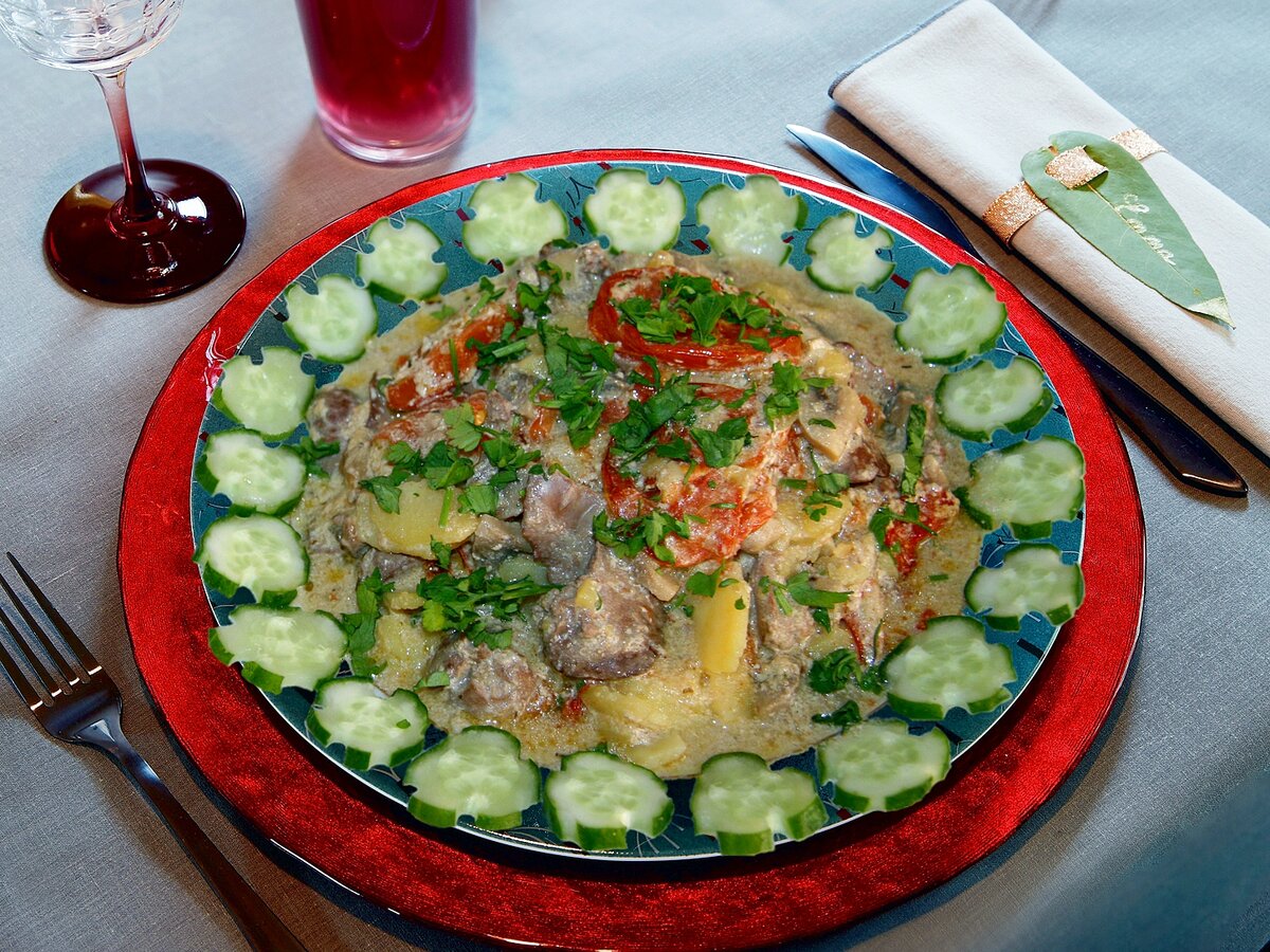 Рецепт для мультиварки и духовки. Я использовала сразу две чаши, но можно обойтись одной. Готовила в мультиварке Panasonic-18. Продукты Куриная печень - 600 г Грибы (шампиньоны) - 400 г Картофель - 1 кг Лук - 1 шт. Сливки - 470 г (1 уп.) Помидоры - 4 шт. Соль Перец чёрный Орегано Чеснок Масло оливковое Приготовление 1. Нарезать овощи, грибы и печень. 2. В чашу мультиварки налить оливковое масло. Установить программу «Выпечка» (40 минут по умолчанию). В других мультиварках выбрать программу «Жарка». Нагревать масло 3 - 5 минут (2 – 3 мин). 3. Положить лук и обжарить до прозрачности. 4. Добавить печень. 5. Обжарить. 6. Затем положить грибы. Потушить немного. 7. Заправить специями. Влить сливки. 8. Довести до кипения и отключить программу. 9. В другую чашу положить картофель. 10. Сверху выложить печень со сливками. Поставить эту чашу в мультиварку на программу «Гречка» («Рис», «Крупа»). 11. После сигнала о готовности, достать чашу из мультиварки. 12. Сверху положить кружки помидоров. 13.