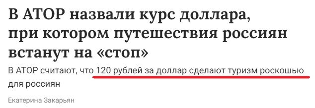 Вице-президент ассоциации туроператоров России (АТОР) Артур Мурадян заявил о резком подорожании туров из-за девальвации рубля, и добавил, что в случае достижения курсом отметки 120 рублей за доллар, путешествия россиян вообще "встанут на стоп", а туризм станет роскошью, которую смогут позволить себе лишь единицы. Госп. Мурадян признает, что в связи с девальвацией рубля с прошлого лета почти в 2 раза, стоимость туров тоже выросла примерно в 2 раза. Если прошлым летом стоимость туров в 2000 долларов - это было 110-120 тыс рублей, то теперь более 200 тыс рублей. Минимальная стоимость путешествия за границу уже сейчас обходится россиянам, по его словам, в 180-200 тыс рублей, что "бьет по самому бюджетному потребителю". Условно, ранее человек, позволяющий себе загранпоездки, мог отложить 1-2 зарплаты, чтобы съездить отдохнуть, что было вполне реально, то теперь уже потребуется 3-4, что куда проблематичнее. Поэтому из-за девальвации рубля больше всего пострадали самые популярные бюджетные на