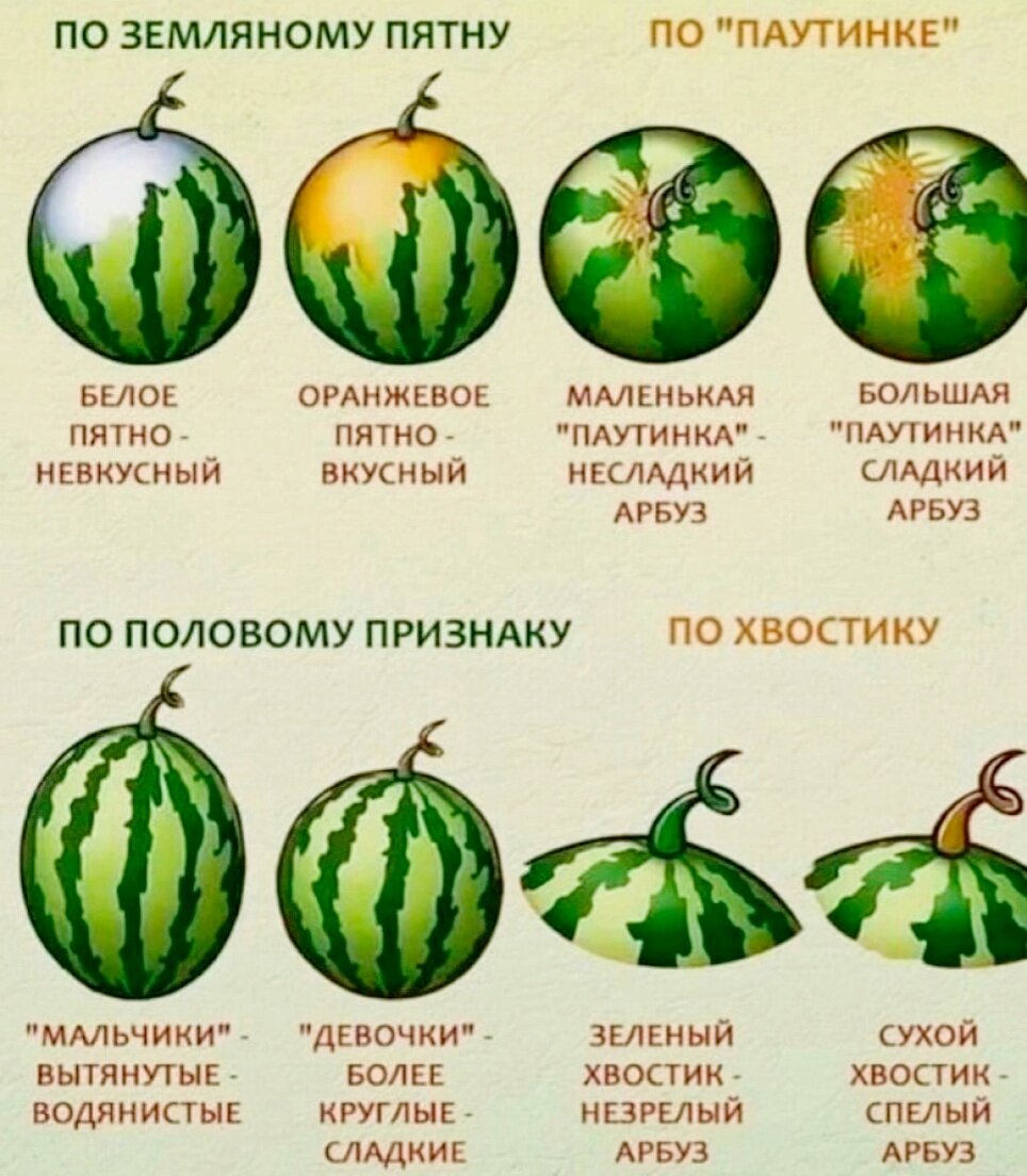 - Хвостик спелого арбуза — сухой, но не пересохший (спелый плод перестает активно впитывать влагу). Если хвост зеленый, значит, арбуз сорвали недавно и он не успел до конца созреть.