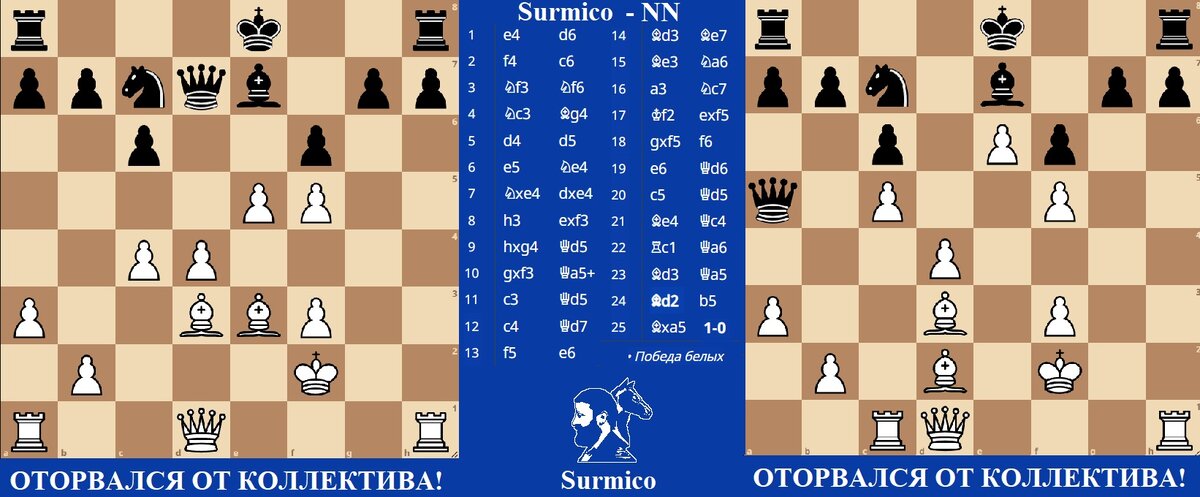 В нашем конкретном случае чёрные переоценили силы ферзя и недооценили согласованность позиции белых. После первого нападения пешкой ферзь мог отступить на d8. И после второго нападения пешкой он мог отступить на d8. И после третьего нападения уже белопольным слоном ферзь мог вернуться на d8. Но как заколдованный он всё больше и больше отрывался от коллектива и выбрался, как ему показалось «на оперативный простор». Но этот простор оказался западнёй! Слоны и пешки при поддержке своего ферзя по существу поймали ферзя и у него не осталось пути к отступлению! Финальная сцена весьма показательна. Отдельно беспомощн