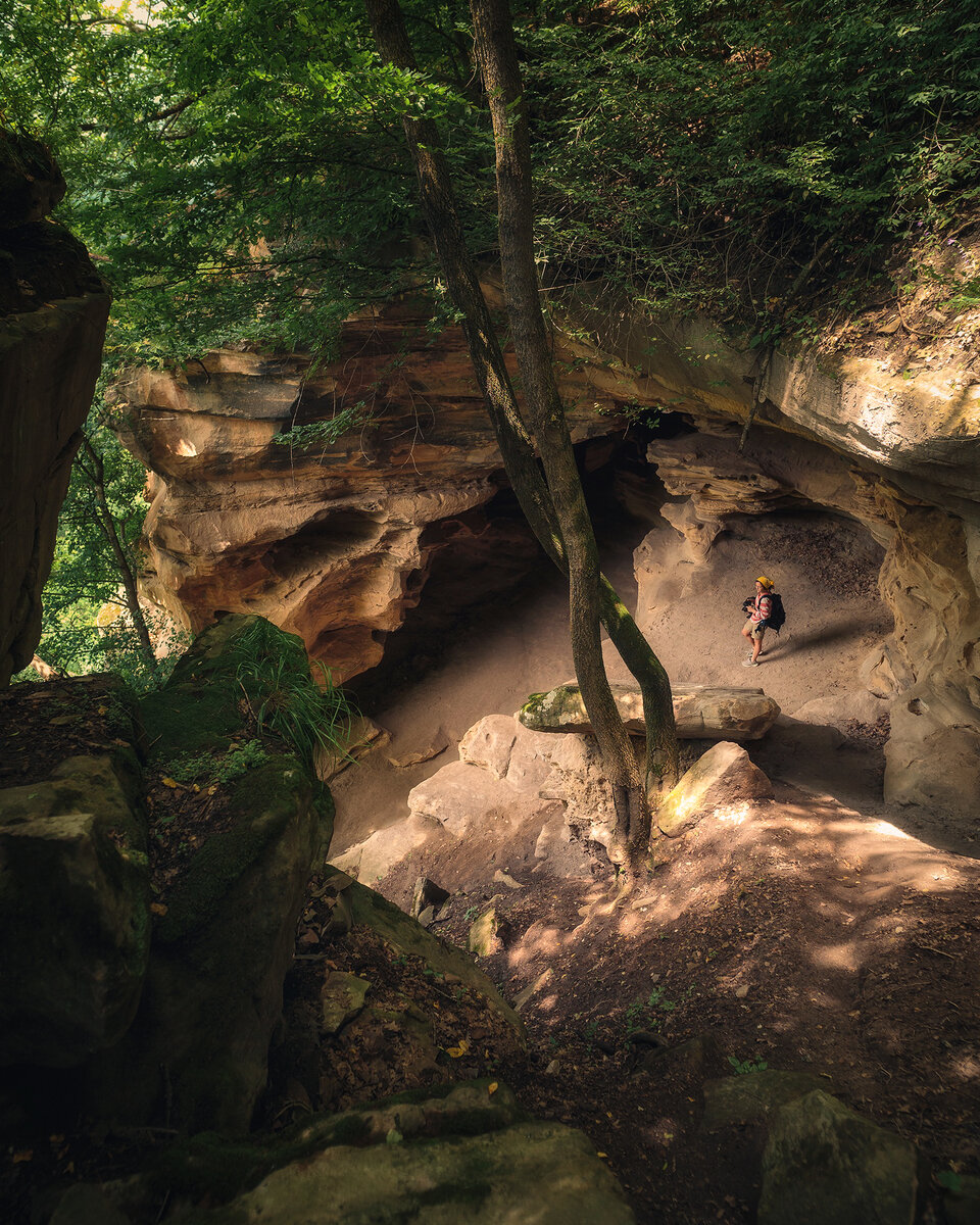 Сегодня поведаю об одной небольшой, но очень впечатлившей меня локации на Кавказе. По возвращению с перевала Гум-Баши в сторону Карачаевска мы заприметили одну точку на карте. Название незамысловатое - «Сырные скалы». Метка стояла где-то в лесу на склоне. Было не совсем ясно, что ждёт нас там. Но так как локация находится прям у дороги, мы решили заскочить туда. Вход на тропу очевидный, широкий. Рядом есть небольшая стоянка. Кроме нас здесь была ещё одна машину с группой туристов, с которыми мы встретились где-то в одной из пещер. Тропа хорошая, видимо, группы сюда все-таки водят. Но нам как-то повезло, и мы смогли даже в одиночестве поснимать пещеры. А ещё тропа очень идёт через очень красивый лес! Невероятно живописный, накрывающий словно зонтиком из зелени песчаные пещеры. Что представляют из себя - это довольно глубокие пещеры, растянувшаяся примерно на 50 метров, так, на вскидку. Насколько мы успели увидеть, пещеры сквозные - из одной было видно другую. Формы пещер - слоис