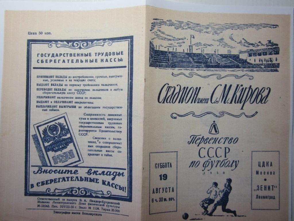 19 августа 1950 года на стадионе имени Кирова в Ленинграде состоялся футбольный матч чемпионата Советского Союза по футболу между местным "Зенитом" и столичным "ЦДКА". Первый гол, 105000 зрителей увидели уже на первой минуте и мяч из сетки вытащил вратарь ленинградцев Иванов, через десять минут он же вытащил и второй. Москвичи завладели серединой поля и оттуда начинали практически все свои атаки с которыми защитники "Зенита" не могли справиться. Матч закончился со счётом 1:8 - полным разгромом игроков с берегов Невы.