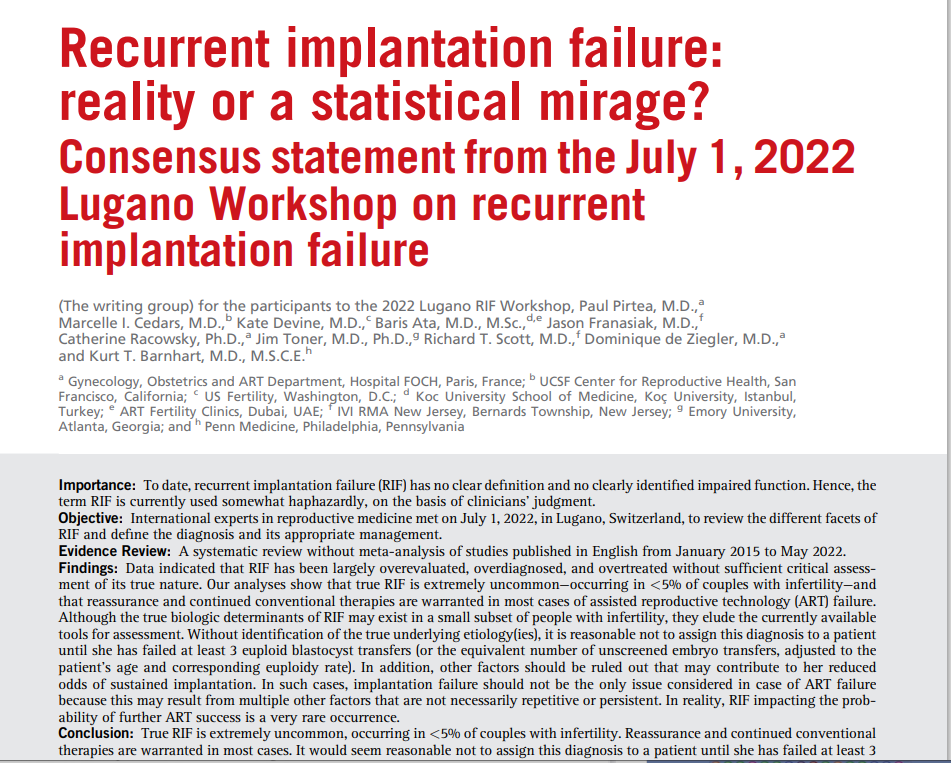 Данная статья представляет консенсусное заключение встречи международных экспертов США и Европы в области репродуктивной медицины на тему рецидивирующих неудач имплантации в циклах ВРТ .( Встреча прошла 1 июля 2022 г. в г. Лугано( Швейцария).)