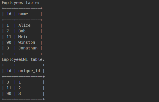 Каждая строка этой таблицы содержит идентификатор и имя сотрудника в компании. Таблица: EmployeeUNI (id, unique_id) - это первичный ключ (комбинация столбцов с уникальными значениями) для этой таблицы.