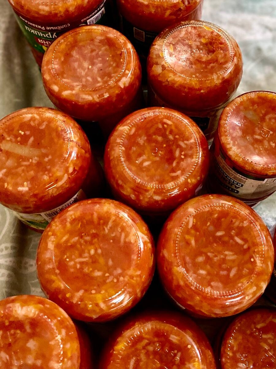 Когда мне случайно попался рецепт этого рисового салата, то в памяти сразу всплыли студенческие годы. Тогда баночка этой заготовки южных овощей была настоящим праздником среди макаронно-гречневых будней. Слегка добавив авторских нюансов, я впервые сама заготовила впрок этот готовый обед или ужин. Как дополнение к вареному картофелю или с рублеными сваренными яйцами это вообще экстаз для гурмана. Но и самостоятельно «завтрак туриста» тоже неплох. Беру его как презент в гости, и любая хозяйка сразу просит рецепт. Он прост, дёшев и быстр в приготовлении. Готовим Провариваем, помешивая, 10 минут. Далее я отступаю от классического рецепта и добавляю по 5 горошин горького и душистого перца, несколько слайсов стручка горького перца и пару щепоток хмели-сунели. Консервируем Банки с закручивающимися крышками (после покупных консервов) промываю, обдаю кипятком и раскладываю в них до самых краёв овощную закуску. Закрутила банки, перевернула, укутала одеялом до остывания. Первую банку семья