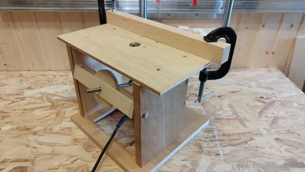 Изготавливая прототип настольного фрезерного станочка (на основе кромочника) с наклоняемым шпинделем, я преследовал, в первую очередь, цель - просто испытать этот вариант, как таковой. Станочек предназначен для мелких хоббийных работ. В качестве наклоняемого узла я использовал входящую в комплект наклоняемую базу, установленную в столешницу, а сам привод наклона был сооружен довольно спонтанно - главное было, обеспечить функционал. Представляет он из себя поворотную рамку, в которую установлен маховик с гайкой, при вращении которого и происходит линейное перемещение шпильки, соединенной в шарнире с кожухом фрезера. В плане удобства пользования это довольно "сырое" решение. Чтобы кардинально поменять угол наклона в таком варианте нужно довольно долго вращать маховик. Понятно, что непосредственно к маховичку ручку не прикрутишь - будет мешать рамка, да и сама шпилька, выходя из маховика будет препятствовать нормальному вращению. Поэтому само собой возник вариант с дополнительной переда