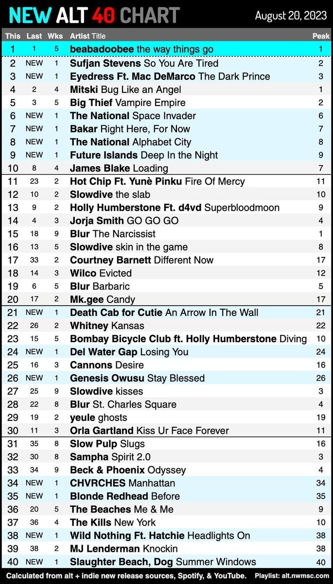 EYEDRESS вместе с Mac DeMarco дебютируют на 3-ом месте. Подробности: У группы THE NATIONAL в чарте две новинки. На 6-ом месте - Space Invader. По ссылке подробности: BAKAR - на 7-ом месте. Новый альбом автора песен "Halo" выходит 22 сентября и призван стать аналогом его микстейпа 2018 года "BADKID". Бакар в своем альт-звучании объединяет огромное количество влияний, оставаясь при этом абсолютно верным самому себе. Новый сингл "Right Here, Right Now" продолжает его путь, и его звуковая непосредственность точно отражает инстинкты Бакара. Второй сингл THE NATIONAL - на 8-ом месте. FUTURE ISLANDS - на 9-