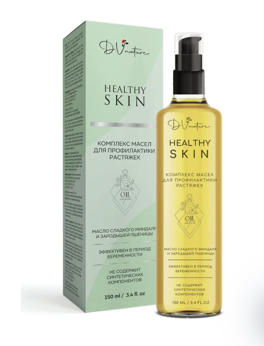 DV NATURE масло для тела от растяжек для беременных и после родов, натуральное, увлажняющее, профилактика растяжек при беременности. Женщины , часто при беременности сталкиваются с растяжками это одно из средств которое поможет бороться с растяжками . О том, что женщина когда-то была беременной, можно узнать по нескольким растяжкам на груди, животе или бедрах. Избежать появления растяжек, сохранив молодость и упругость кожи, в период беременности и после родов, поможет особенно тщательный уход за своей кожей. Косметика для беременных обеспечит интенсивное увлажнение и питание, позволив уменьшить видимость растяжек и предотвратить их появление. Масло от растяжек для беременных HEALTHY SKIN специально подобранный комплекс растительных масел и экстрактов (миндальное масло, масло зародышей пшеницы, масло жожоба, масло виноградной косточки, масло арники), доказавших свою эффективность в борьбе против растяжек. За счет своего жирнокислотного состава, близкого к естественному составу липидн