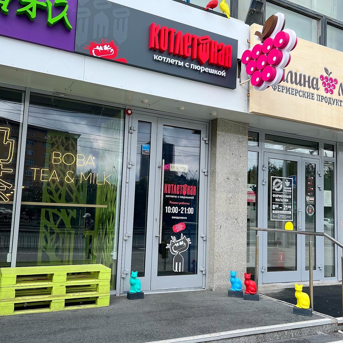 «Котлетошная» открылась на Красном проспекте. Она делит вход с кафе китайской кухни «Молочай». Подзаголовок названия «котлеты с пюрешкой». Собственно, главные в блюда в заведении — котлеты и картофельное пюре. Само помещение, в который ведёт удлиненный коридор, небольшое: пара столов и высокая стойка у стены, на которой есть крючки для сумок. Интерьер забавный, всюду обыгрываются коты. Просто и симпатично. Котлет семь видов. От печёночной по 145 ₽ до котлеты «из рыбов и крабов» по 255 ₽. Можно взять котлету с пюре, а можно — в лепёшке с салатом коул-слоу, удобно для перекуса на ходу. Ни пюре, ни лепёшка в стоимость не входят. Их нужно покупать отдельно, что сразу же утяжеляет чек. Взял говяжью котлету с халоапеньо Мачо по 220 ₽, а к ней пюрешку домашнюю по 90 ₽ и чай на алтайских травах (80 ₽). Подают блюдо в металлической двухсекционной миске, отдалённо напоминающей те, из которых едят и пьют главные герои заведения. Приборы одноразовые, но качественные. Котлета хороша.