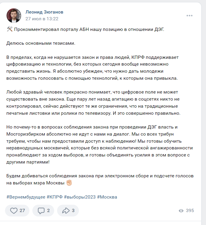 💻 Первое. Из текстов кандидата явствует, что он не возражает против электронного голосования в принципе: