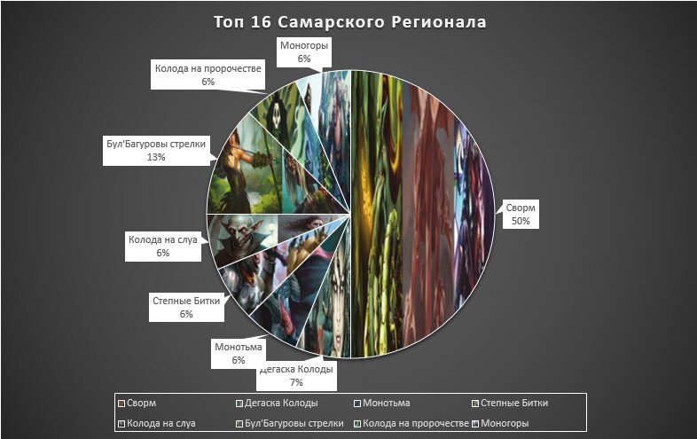 Как мы видим в Самарском регионале хоть и сворм занимает довольно весомую часть колод представленных в турнире, но все же это половина от топ 16, а в общем количестве заявленных колод выходит даже меньше 50%, самыми же популярными вариациями сворма в Самаре как мы видим, выступают Горы-Болото-Тьма и Болото-Тьма.