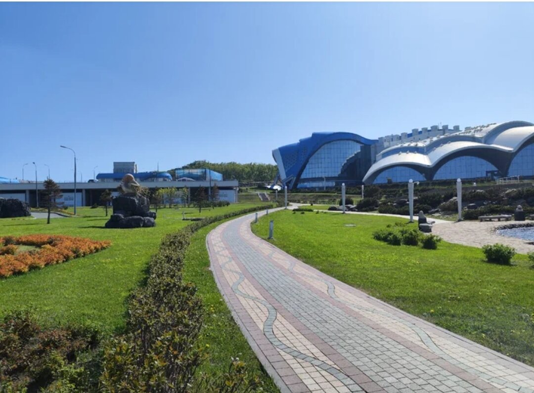 Приморский океанариум стоит обязательно посетить прибывая на острове Русский, так как он является главной достопримечательностью острова и одним из лучших океанариум в России. На остров Русский можно попасть через мост, как на автомобиле так и на другом общественном транспорте. До океанариума ехать 15 минут, также во время пути мы можем встретить специальные указатели на него. Не доезжая до входа в океанариум мы можем наблюдать несколько парковок, где можно бесплатно оставить свой автомобиль. Дальше проехать нам не разрешили и сказали что проезжают только сотрудники. Однако рядом с парковкой есть бесплатный автобус, на котором можно доехать до здания кассы и главного здания. Всего идти около 800 м. дорога хорошая и интересная. По пути встречаются различные красивые скульптуры, всё благоустроено. Перед входом в главное здание, необходимо приобрести билеты в кассе. Цена на двух взрослых и одного ребенка а будний день составила 3.750 руб. При выборе билетов мы можем к