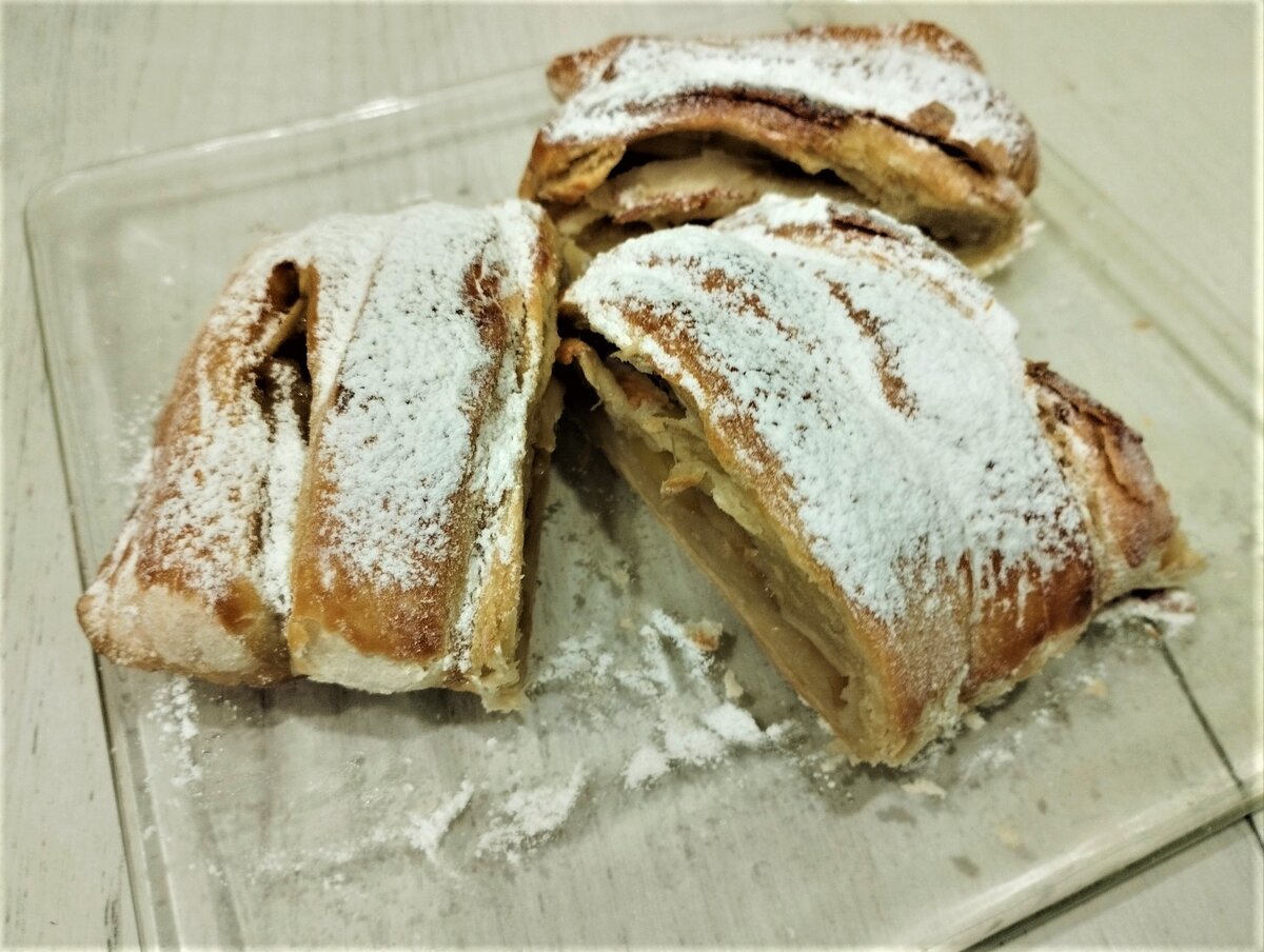Приветствую всех ! Яблочная пора и мы , конечно , печем всевозможные пироги . Здесь я расскажу , как пеку яблочные пироги из слоеного теста. Что нужно : 1 упаковка слоеного теста ( я беру бездрожжевое ) 3-4 средних яблока мука для раскатки теста масло растительное или сливочное для смазки 1 яйцо сахарный песок сахарная пудра Что делать : Яблоки нарезать дольками и посыпать сахарным песком. Тесто разморозить ( у меня 4 листа ) и раскатать . Надо , чтобы получился длинный прямоугольник . В середину выложить дольки яблок. По бокам нарезать полоски и поочередно положить сверху. Закрепить сверху и снизу . Пергамент постелить на противень и смазать маслом . Выложить пироги . Взбить яйцо и хорошенько смазать сверху пироги . Посыпать сахарным песком . Выпекать 30 минут при 200"С . Пироги готовы ! Приятного чаепития ! До новых встреч !
