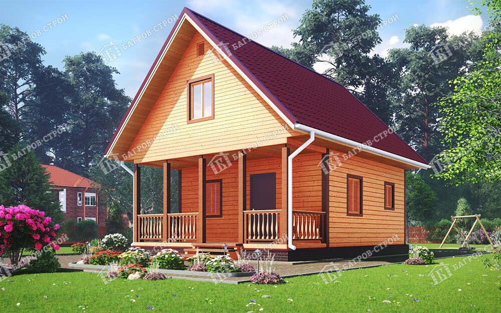 Дионис — двухэтажный дом из бруса, размером 6х8м., с террасой. Сруб дома 6х6м выполняется из профилированного бруса, 2-й этаж – каркасный (мансарда) с утеплением. Планировкой предусмотрено 3 помещения на первом этаже и 2 раздельные спальни на втором этаже, терраса 2х6м с ограждением, и ступени при входе в дом. • Площадь: 74 м2