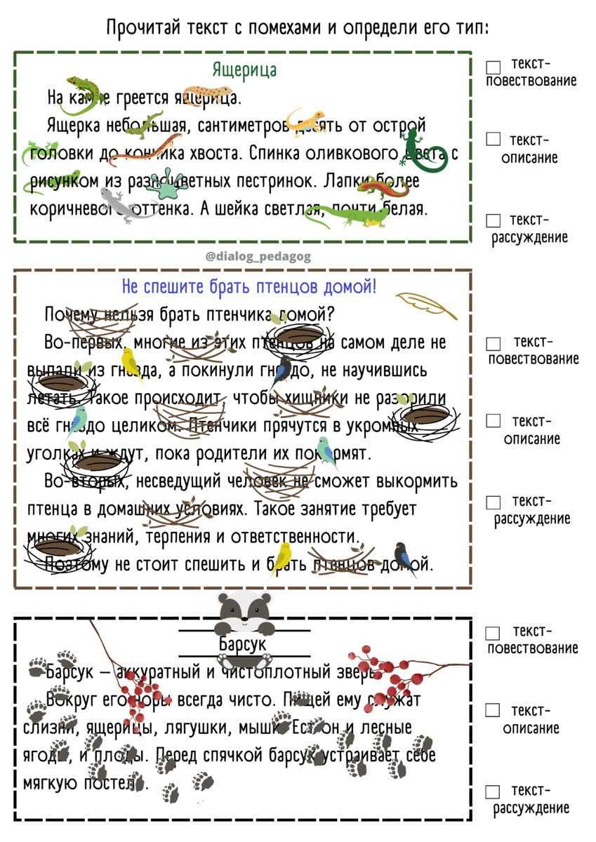 Совместила упражнение из курса скорочтения с первыми темами сентября по русскому языку во 2-4 классах "Типы текстов". Дополнительно можно повторить темы "словосочетание", "члены предложения" и т.д. (всё зависит от целей урока и фантазии учителя). ✅Цель: прочитать текст с помехами, определить его тип (поставить ✔). ➕Варианты дополнительной работы: 🔹выделить грамматическую основу предложений 🔹найти и выделить однородные члены предложения 🔹выполнить синтаксический разбор предложений 🔹объяснить орфограммы в словах и т.д. Подобная работа развивает навык смыслового чтения. Более подробно писала здесь. Кому понравилось, можете скачать и использовать в работе ☝Для своих учеников буду ещё делать подобные комплексные рабочие листы, если актуально, пишите в комментариях, буду делиться💙.