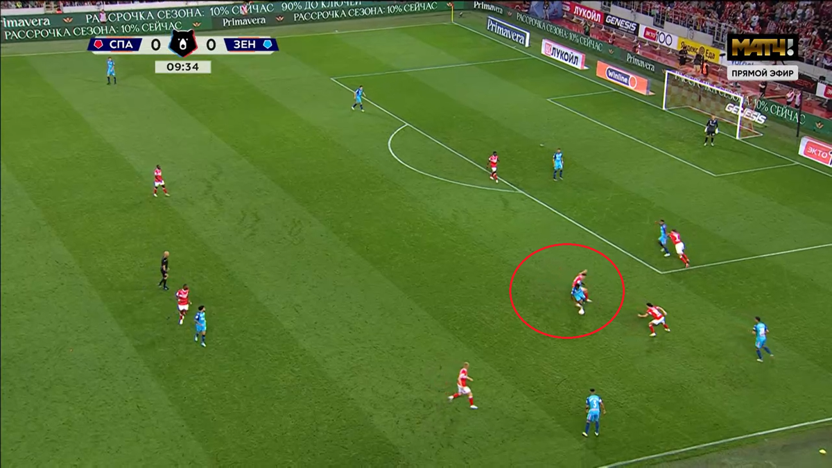 «Ромбовые 4-4-2 «Спартака» вот так накладывались на 3-5-2 «Зенита»: Промес и Соболев ориентировались на ЦЗ, десятка Игнатов встречал Барриоса, восьмерки Мозес и Медина ориентировались на фланги, а Мартинс их страховал.